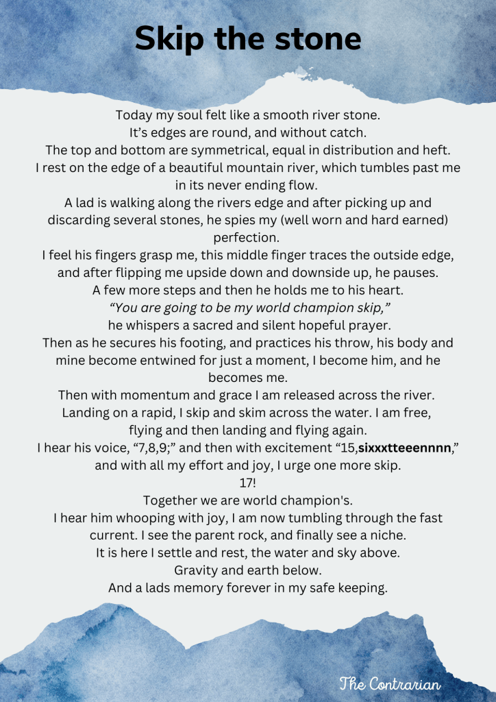 A lad is walking along the rivers edge and after picking up and discarding several stones, he spies my (well worn and hard earned) perfection.